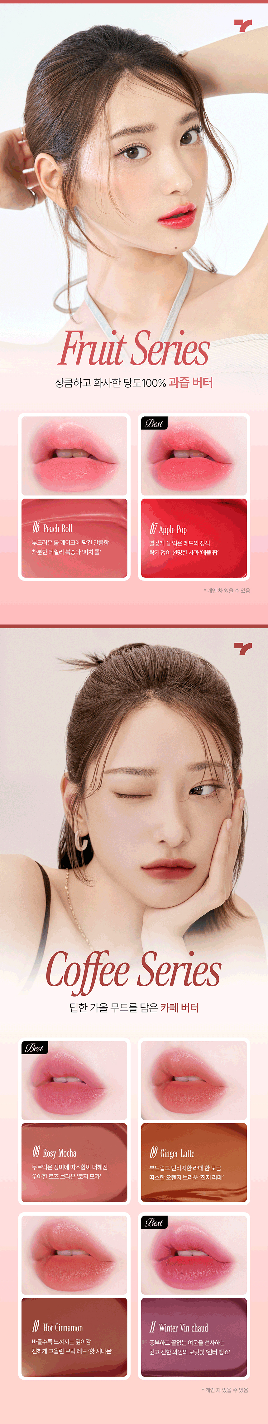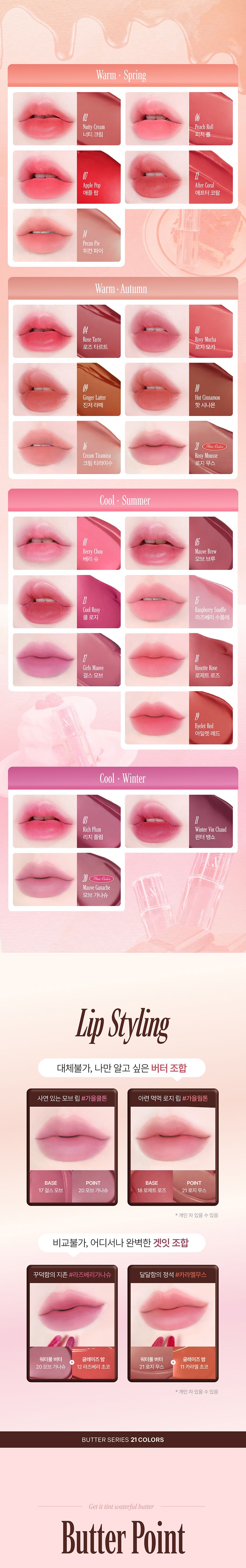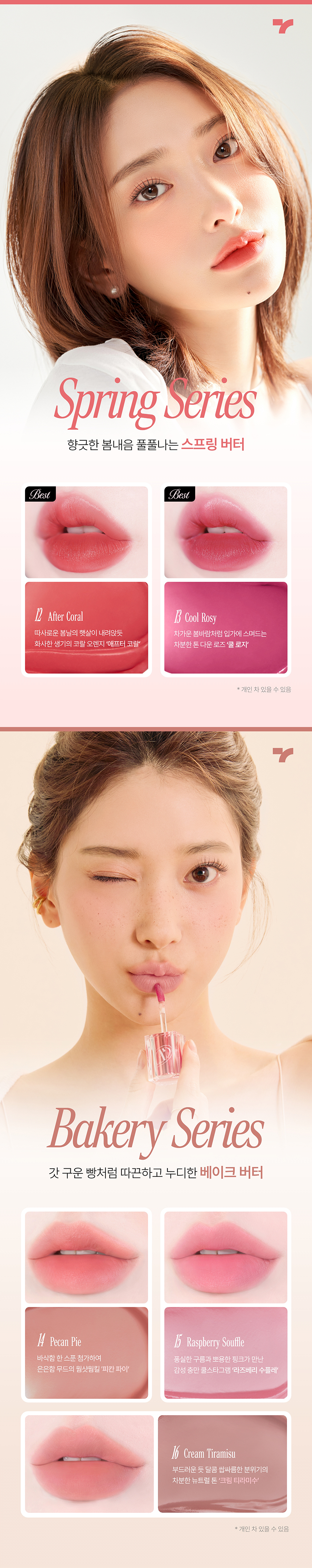 The no.1 overall sales ranking with fastest sales upon release. Butter tint with soft finish and moisturizing texture that comfortably applies on lips. Provides upgraded daily tone. The deeply moisturizing velvet texture smears into your lips and provides velvet finish with non-smudging as if butter melts and smears into bread. The base formula used in glow tint is applied to provide unique moisturizing effect that cannot be found in other velvet tints. Provides clear color without the need for touch-up with a single touch. The flat applicator provides soft gradient lips without lumps or stain.