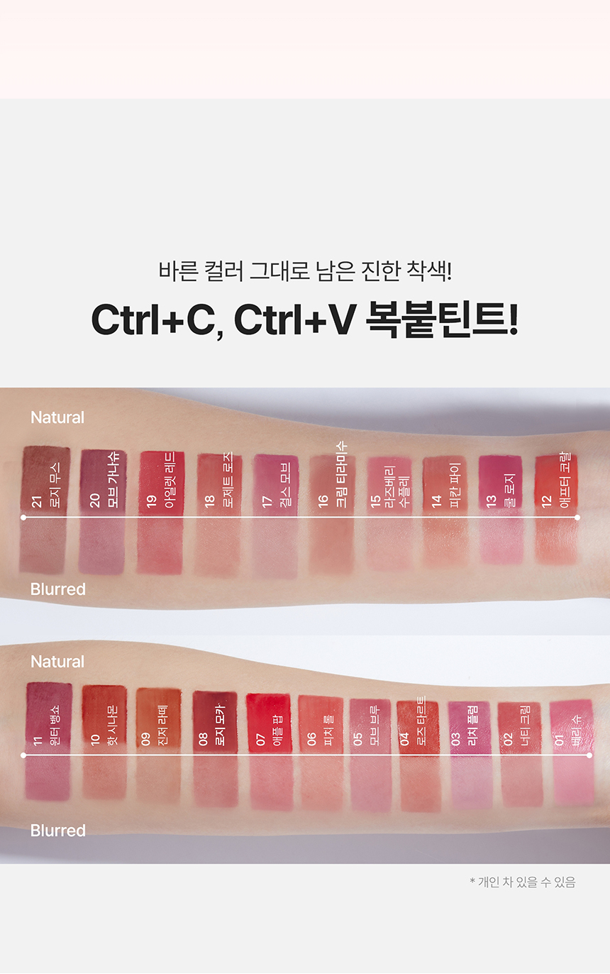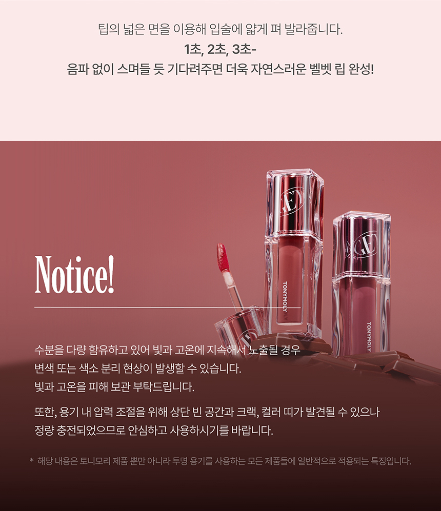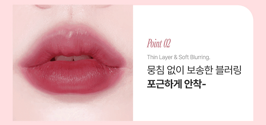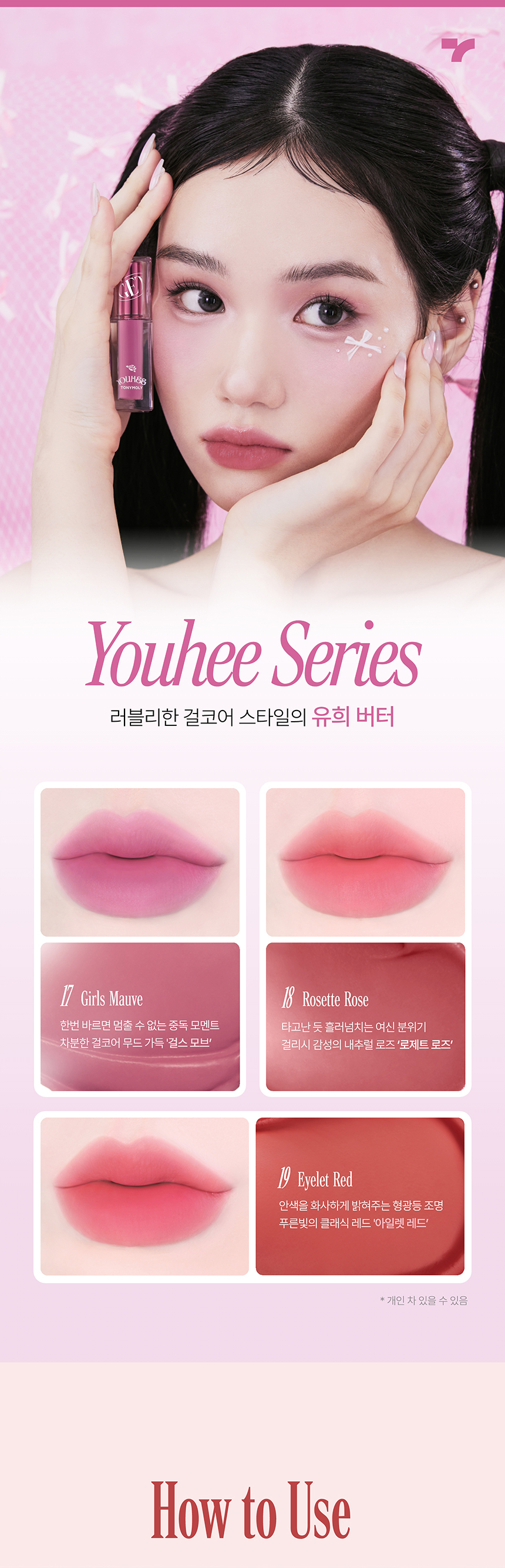 The no.1 overall sales ranking with fastest sales upon release. Butter tint with soft finish and moisturizing texture that comfortably applies on lips. Provides upgraded daily tone. The deeply moisturizing velvet texture smears into your lips and provides velvet finish with non-smudging as if butter melts and smears into bread. The base formula used in glow tint is applied to provide unique moisturizing effect that cannot be found in other velvet tints. Provides clear color without the need for touch-up with a single touch. The flat applicator provides soft gradient lips without lumps or stain.