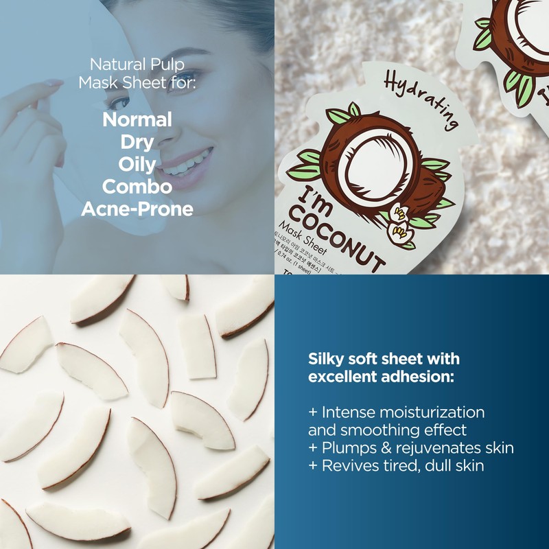 • Hydrating Cloth Mask The 3-ply rayon cloth is filled with coconut extract, vitamin E and other skin-enhancing ingredients to deliver hydration to the skin. Coconut extract and vitamin E - improves and hydrates the skin. Use: Place the mask on the cleansed, towel-dried face. Leave to work for 20-30 minutes. Pat excess product into face and neck until fully absorbed.