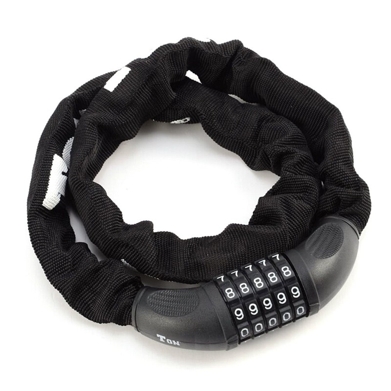 Features:<br/>- Color: mainly black.<br/>- Material: Acrylonitrile Butadiene Styrene (ABS) Plastic, long lasting hard Manganese Steel and soft nylon.<br/>Size (Dia.* L): via 6 mm * 900 mm.<br/>- 5 – Digits coded lock password combination lock, ideal for motorcycles, mountain bikes, city bikes, common bikes, baby carts, turning etc.<br/>- Easy, effective and convenient to use.<br/>- Easy reset the password must for bicycle lock your own.<br/>- Portable size and robust structure, easy to use and carry.<br/>Such as the new password:<br/>Step 1] open the barrier created by the original password 00000.<br/>Therefore 2nd turn the control clockwise of 90 degrees.<br/>3 Insert a new password.<br/>4) turn the knob on the original position.<br/>Package includes:<br/>1 * TONYON Professional Motorcycle Mountain Bike Bicycle 5 Digit Anti Theft Security Coded Lock password lock steel chain cable lock (Black)