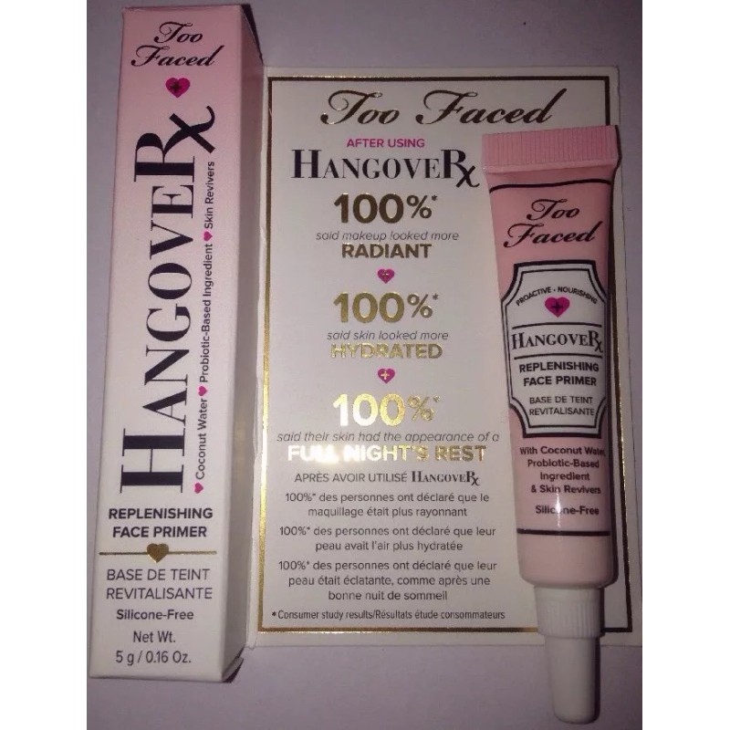 A replenishing face primer that hydrates, smoothes, and brightens skin for a dewy, healthy looking finish.Cure your next beauty hangover with Hangover, a revolutionary makeup primer that's infused with coconut water, a probiotic-based ingredient, and skin revivers which work together to boost skin’s radiance, promote elasticity, and help hydrate while locking down makeup for fresher, longer, and more flawless wear. Too Faced harnessed the science of hydration to create a creamy, penetrating primer that acts like an energy drink for the skin by replenishing moisture levels. It can be worn alone for a dewy, healthy looking finish, or under bronzers, foundations, and powders to create the perfect canvas.Formulated without: Parabens, Sulfates, Phthalates.This product is cruelty-free, vegan-friendly, and silicone-free.