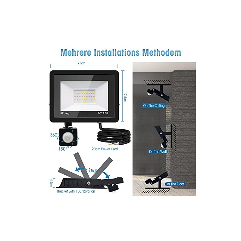 - ??Innovatives Design?? LED Strahler mit Bewegungssensor schaltet sich automatisch ein, wenn Bewegung erkannt wird. 30W Induktionslicht beleuchtung kann 3000LM erreichen, und 6500K kaltwei?e Lichtbeleuchtung kann einen breiteren Bereich der Beleuchtung gew?hrleisten. Die Induktionslampe ist mit 75cm Kabel ausgestattet, das f??r die Installation bequem ist.