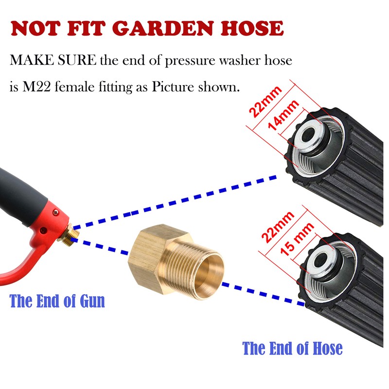 - If hose has M22 14mm fitting with 14mm inside diameter, please connect to hose directly. If hose has M22 15mm fitting with 15mm inside diameter, please connect the brass coupler to gun and hose.