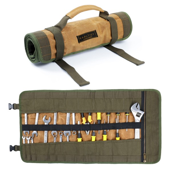 Tool Roll Bags, Portable Tool Roll with Buckle & Carry Handle, Robust 16 oz Waxed Canvas, Tool Organiser with 23 Compartments (Khaki), Tool Bag Roll Bag for Hammers Chisel