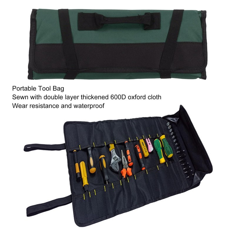 - PORTABLE DESIGN: This tool pouch saves space greatly after rolling up, can be securely fixed with 2 external straps without falling, with portable handle, easy for carrying around.