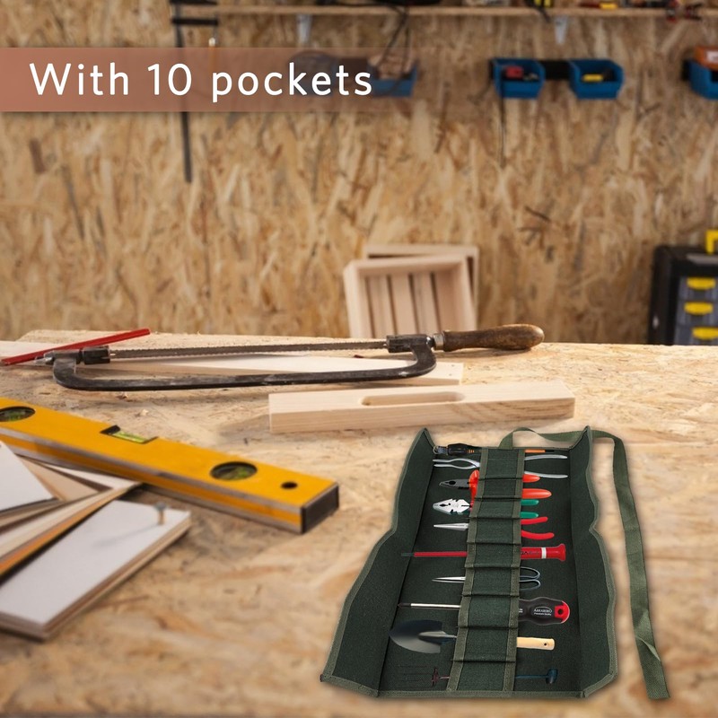 Made of canvas, solid and durable, it can protect your tools. It is portable and efficiency, and can be rolled up. It can make your tools orderly contained, make your work convenient. The green color makes it dirt-proof, and it is big enough to contain many tools. There has ten places to insert tools in, and each of them is about 5cm wide, convenient and practical to use.