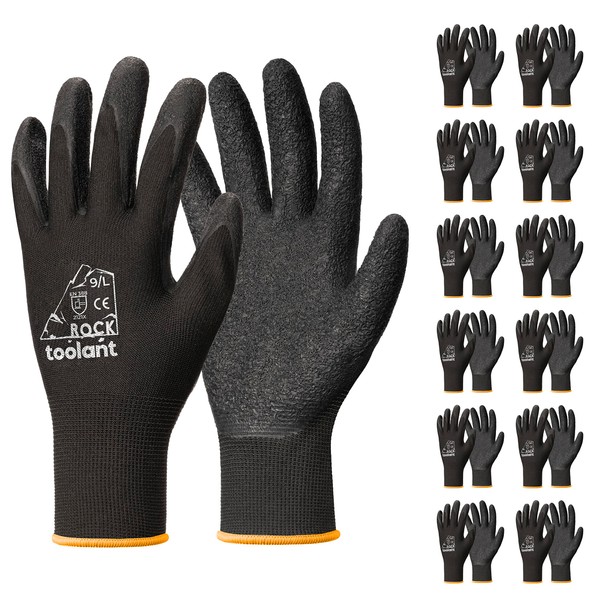 toolant Work Gloves Men, 12 Pairs Crinkle Latex Rubber Gloves for Construction, Gardening, Warehouse (Black, Large)