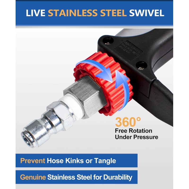 - [ Upgraded STAINLESS Swivel Gun ]: Clean with ease by using this pressure washer short gun with swivel, allowing your hose to rotate freely during high pressure use. Say goodbye to the frustration of kinking and tangling hoses. The installed live swivel is made of premium stainless steel, anti-rust and high temperature resistant