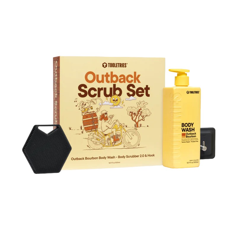 The Tooletries Scrub Kit is the ultimate grooming bundle for a refreshing and invigorating shower experience. This kit includes the Silicone Body Scrubber 2.0 & Hook and the Outback Bourbon Body Wash 500ml, designed to provide a thorough and enjoyable cleansing routine. The Silicone Body Scrubber 2.0 offers a superior exfoliating experience, while the Outback Bourbon Body Wash delivers a rich, aromatic lather that leaves your skin feeling clean and rejuvenated. Together, they make the perfect duo for anyone looking to elevate their shower game. What is included in Tooletries Scrub Kit? • Silicone Body Scrubber 2.0 & Hook • Outback Bourbon Body Wash 500ml What are the features and benefits of Tooletries Scrub Kit? Silicone Body Scrubber 2.0 & Hook: The Silicone Body Scrubber 2.0 is designed with soft, flexible bristles that provide a deep and gentle exfoliation, removing dead skin cells and promoting healthy skin. The included hook allows for easy storage and quick drying, ensuring your scrubber stays clean and hygienic. Outback Bourbon Body Wash 500ml: This body wash features a unique blend of natural ingredients and a captivating Outback Bourbon scent that invigorates your senses. Its rich lather cleanses the skin thoroughly, leaving it feeling soft, smooth, and refreshed. Who is Tooletries Scrub Kit for? The Tooletries Scrub Kit is perfect for anyone looking to enhance their shower routine with high-quality grooming products.