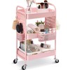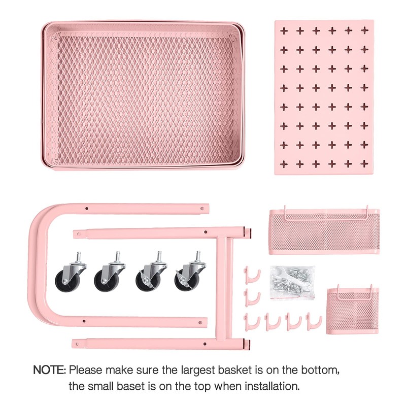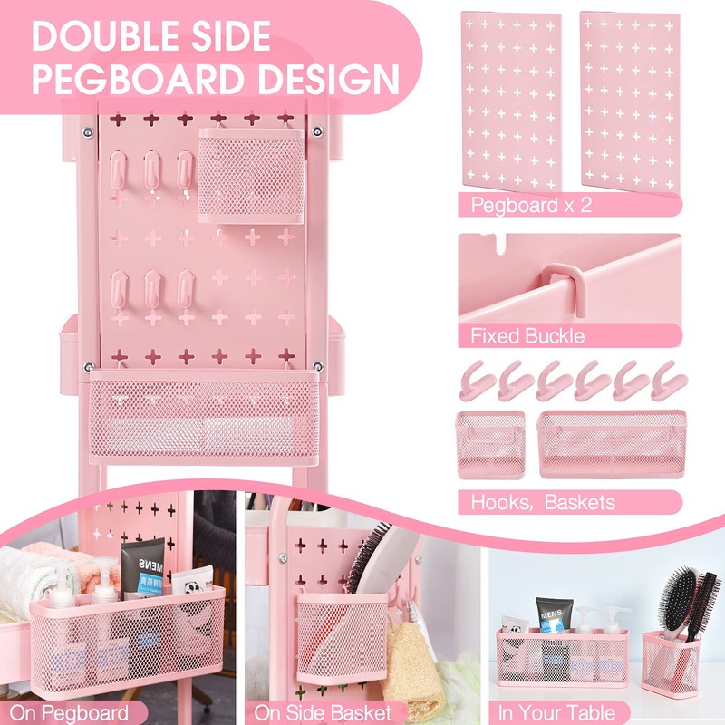 TOOLF 3-Tier Utility Cart, Metal Rolling Storage Cart with DIY Pegboards, Art Craft Trolley with Baskets Hooks, Organizer Serving Cart Easy Assemble for Office, Bathroom, Kitchen, Kids' Room, Pink