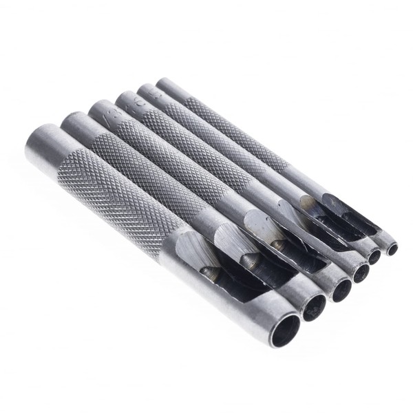 Punch sizes include with this 6pc set are: 5/16 inch (8mm), 1/4 inch (6.5mm), 7/32 inch (5.5mm), 3/16 inch (5mm), 5/32 inch (4mm) and 1/8 inch (3mm).