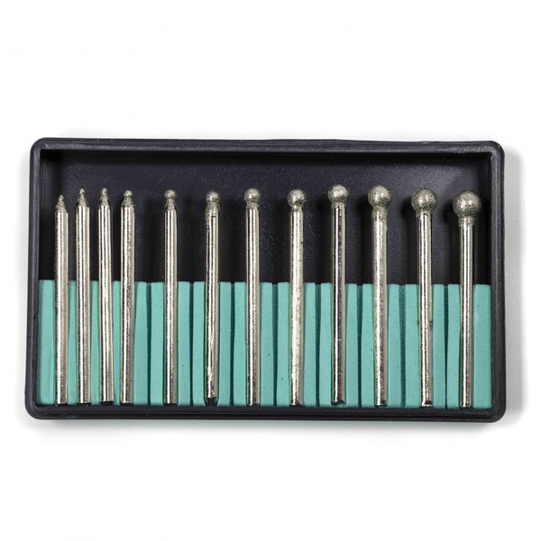 This set comes with 12 different assorted head sizes, all of which are designed to be compatible with a myriad of materials including glass, tile, wood, ceramics, fiberglass, stone and other all natural materials. Some common uses for these diamond burrs include jewelry making, pottery, home improvement and metalworking.