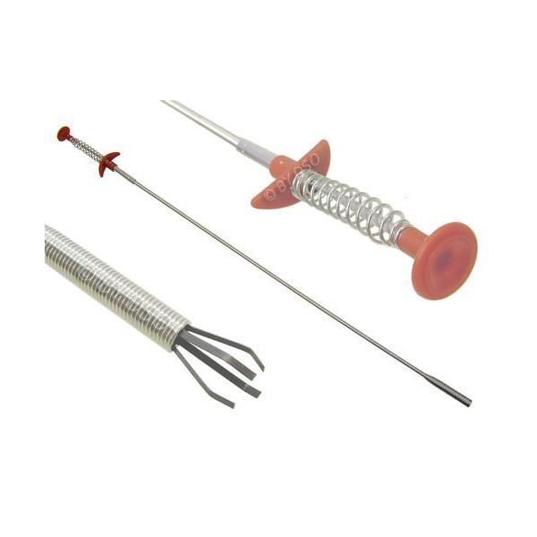 Spring loaded button to open and close grabber. Fully flexible for access in awkward spaces. Grabber consists of four metal hooks that hold tight onto the object being picked up.