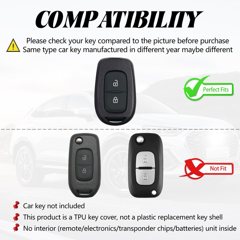 - Compatibility: Please note the 3rd Picture! If you have any questions, please send us a picture of your car key. Key case is compatible with Renault Twingo Clio Symbol Kwid Trafic Captur Laguna Scenic Master Megane Dacia Logan Sandero Stepway Duster Dokker Lodgy.