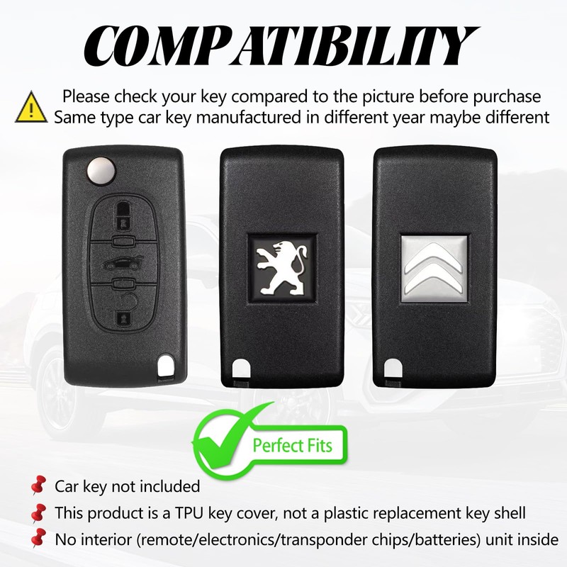 - Compatibility: Please note the 3rd Picture! If you have any questions, please send us a picture of your car key. Key case is compatible with Peugeot 106 107 206 207 208 306 307 307S 308 406 407 408 409 508 607 806 807 1007 2008 3008 4007 4008 5008 2BT Expert Partner Boxer RCZ iON Citroen C1 C2 C3 C4 C5 C6 C7 C8 DS3 DS4 Xsara Grand Picasso Berlingo Saxo Jumpy Nemo Evasion Dispatch Versailles C-Crosser C-Zero C-Quatre C-Triomphe Fiat Scudo Ulysse Ducate. o Toyota Proace.