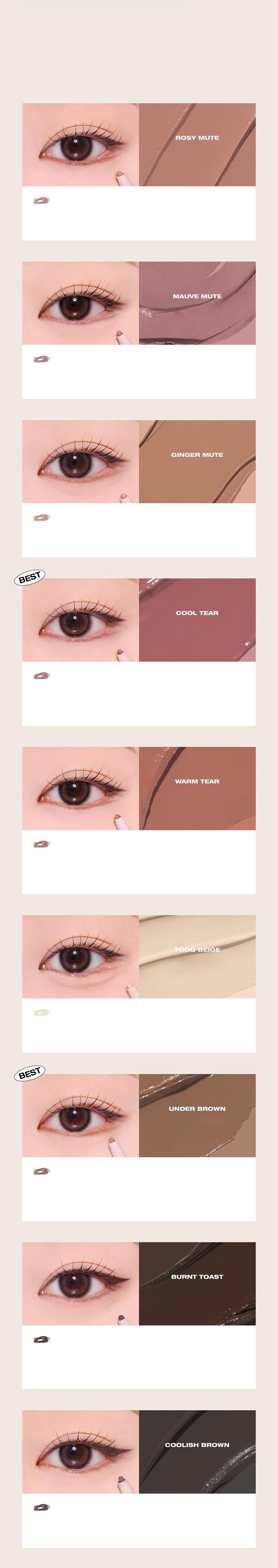 Gentle to sensitive eyes without stimulation. It is drawn smoothly and continuously without clumping or disconnecting with high-density soft pigments. With tooq’s special water/oil-proof technique, it adheres strongly without smudging before cleansing. Featuring tooq's unique Melting Fix Complex and Dry Formation technology, it stays smudge-free until cleansing and ensures smooth, uninterrupted application.