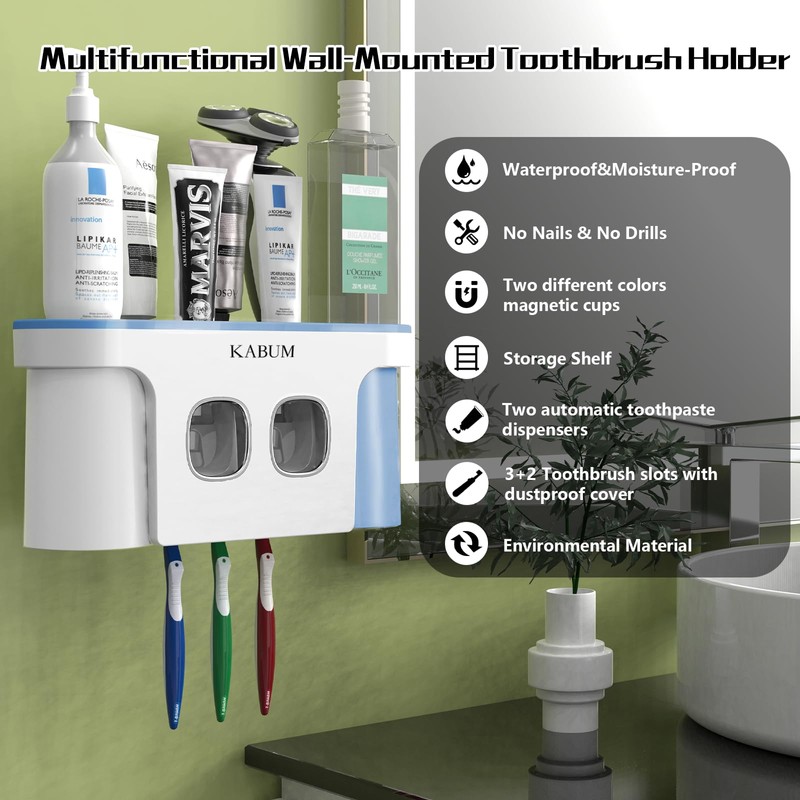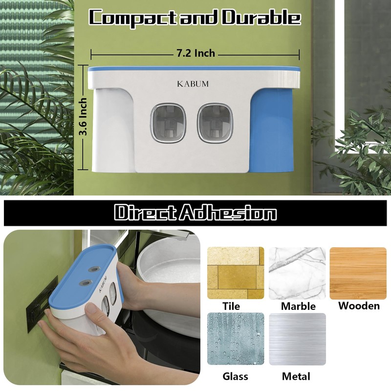 • [Multifunctional Design]- KABUM tooth brushing holder is equipped with 2 magnetic mouthwash cups, 2 automatic toothpaste dispensers, and 3+2 toothbrush slots. We have expanded the spacing distance of the toothbrush slots so that ordinary,electric and children’s toothbrushes can fit well into KABUM toothbrush holder without looking crowded.The mouthwash cup adopts a magnetic levitation cup with and inverted design,which can be fixed on the tray for quick drainage.