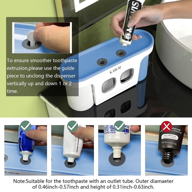 • [Two toothpaste dispensers]- Two toothpaste dispenserrs can satisfy parents and children to use different kinds of toothpaste at the same time,and also can satisfy different adults to use toothpaste with different functions.Note:Suitable for the toothpaste with an outlet tube. Outer diameter of 0.46inch-0.57inch and a height of 0.31inch-0.63inch.