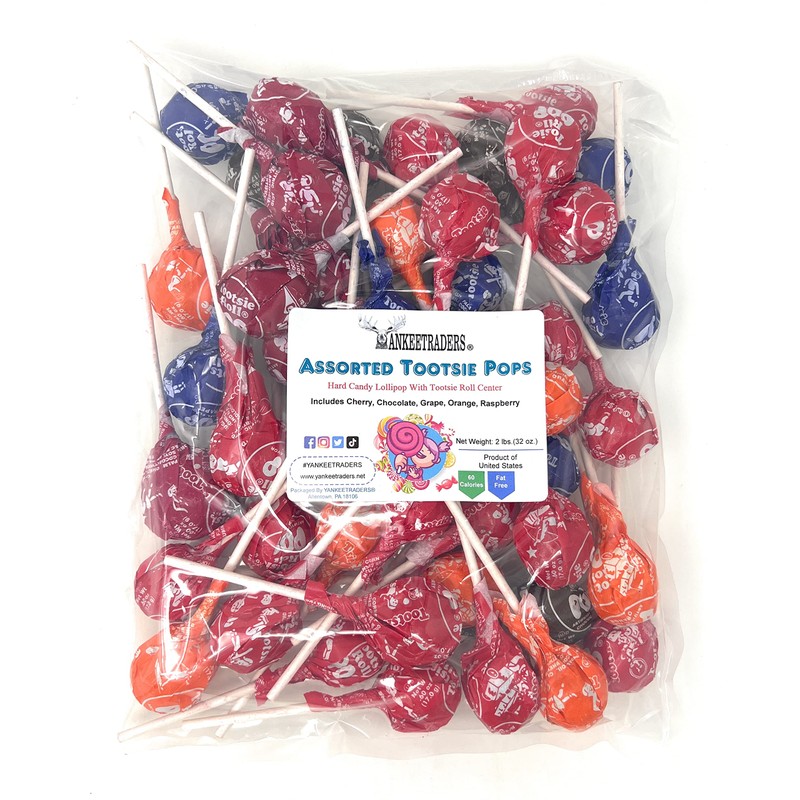 Tootsie Pops assorted flavors. With a chewy Tootsie Roll center and covered