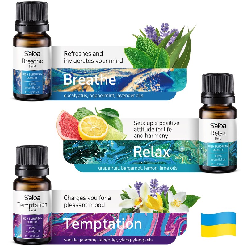- Essential Oils Blends Set Includes the Following Aromatherapy Diffuser Oils Scents - Breathe, Good Dream, Stress Away, Sunny Mood, Temptation (Love), Relax