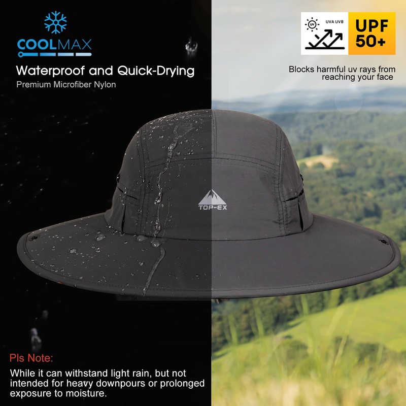 - Waterproof Fabric & Lightweight Breathability - Crafted from advanced water-repellent material, the hat protects you from light rain or damp environments. Its lightweight fabric and ventilated design promote continuous airflow, reducing heat build-up and perspiration so you can stay cool even in hot, humid weather.