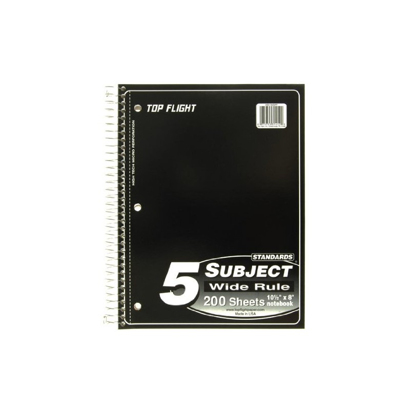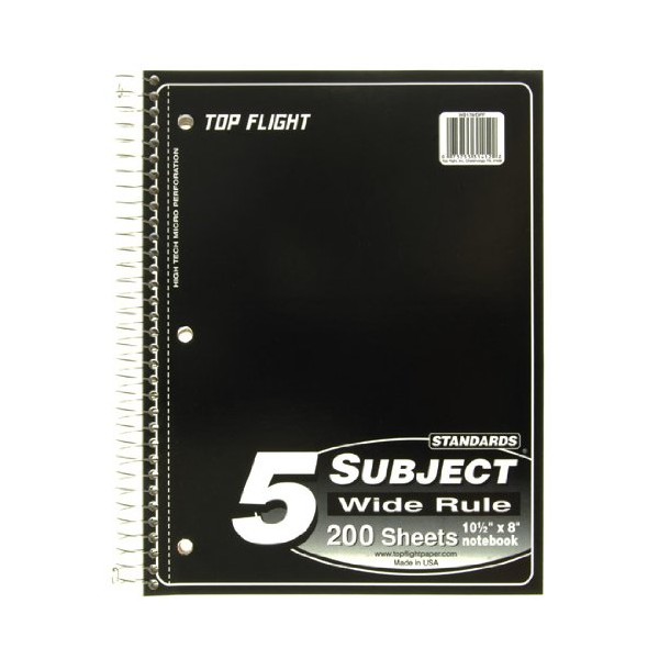 Top Flight Standards 5-Subject Wirebound Notebook, 200 Sheets, 3-Hole Punched, Wide Rule, 10.5 x 8 Inches, 1 Notebook, Color May Vary (31412)