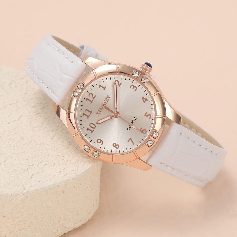 - CLASSIC LEATHER WATCH: This women's leather watch is made of original quartz analog movement and battery, accurate timekeeping, with night-luminous design at the numerals, so you can see the time more clearly at night. The classic round and Arabic numeral dial with 8 zirconia stones in the case is designed for women, and the soft leather strap is comfortable to wear for everyday wear.