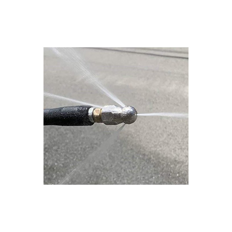 - High-pressure water is rejected from 1 nozzle in the front and 3 in the back of the tip, moving along the piping to eliminate clogging