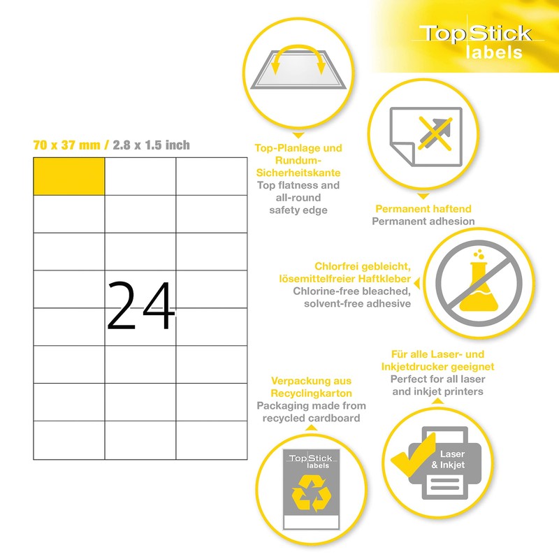 - Box contents: 2400 x TopStick labels, DIN A4 format, 7 x 3.7 cm, rectangular, white (100 sheets each 24 labels)