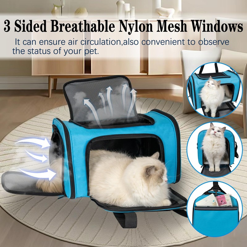 - [Comfortable and breathable dog cat carrier] This cat dog soft sided carrier bag has 4 sided breathable windows. It can ensure air circulation, so that your pet is not stuffy and unable to breathe inside the bag. The nylon mesh window also makes it easy for you to keep an eye on your pet at all times.