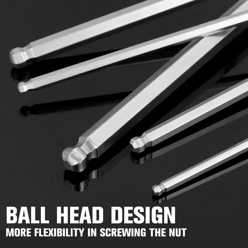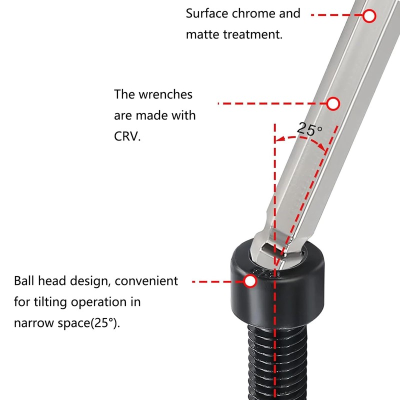 Elevate your toolkit with the Ball End Hex Key Wrench Set, engineered for precision, durability, and versatility. Constructed from premium chrome-vanadium (CR-V) steel, these wrenches offer superior strength and wear resistance, ensuring long-lasting performance for both light and heavy-duty tasks. The innovative ball end design provides up to a 25-degree entry angle, allowing you to effortlessly access fasteners in tight and confined spaces—perfect for intricate household DIY projects and professional machine repairs.
