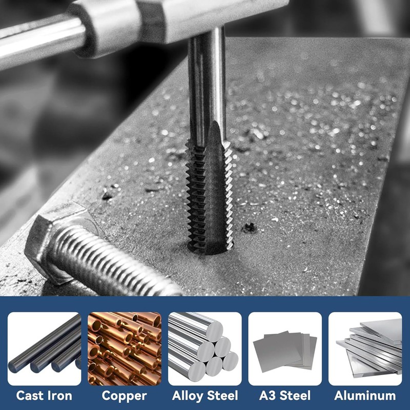 - [Wide Applications]: The die is ideal for processing, correcting, or cleaning external threads, while the thread tap is suited for creating through-hole or shallow-hole female threads. It’s suitable for tapping materials such as stainless steel, aluminum alloy, cast iron, copper, aluminum, and plastic, making it perfect for maintenance and repair work.
