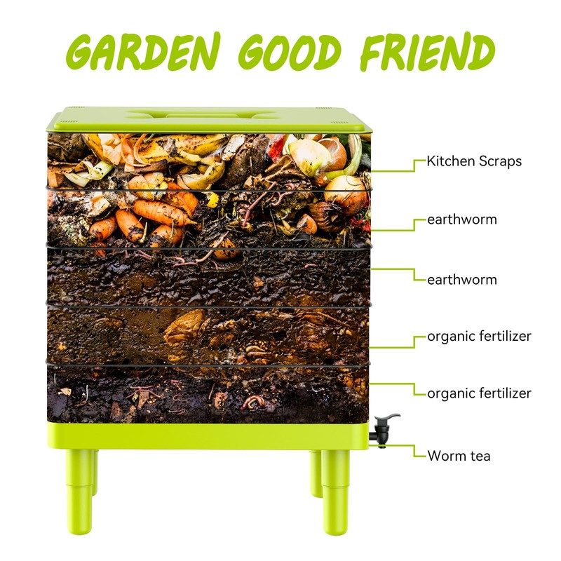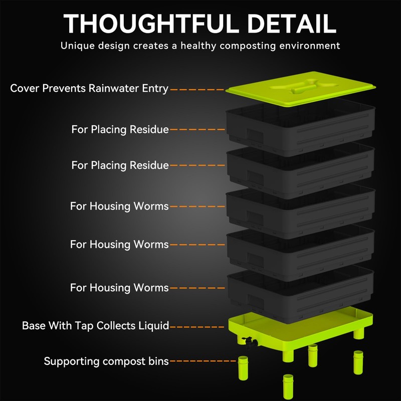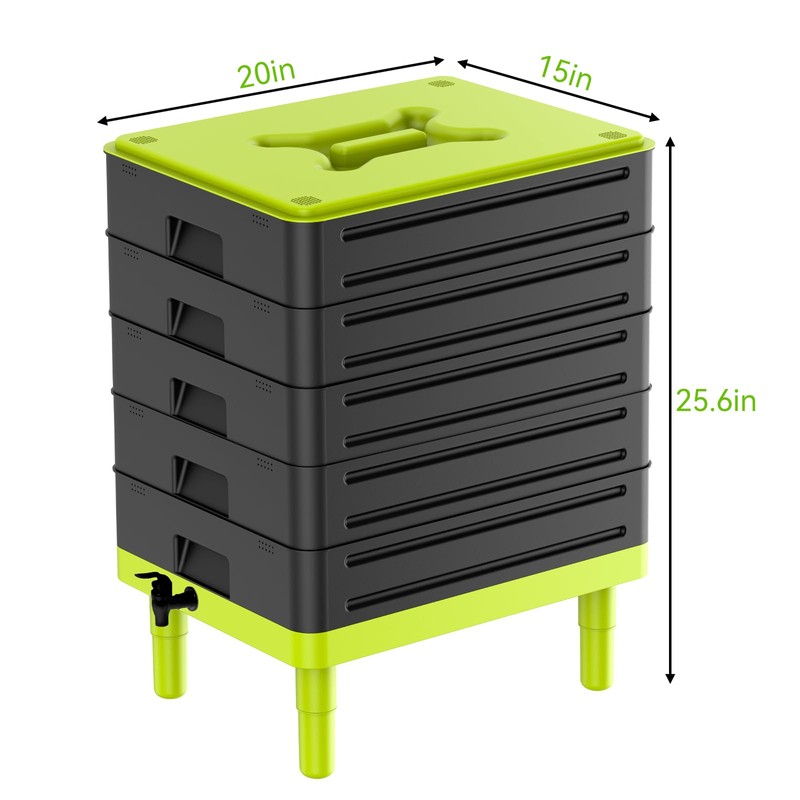 - EASY TO INSTALL AND USE: The five-layer composting bins can be easily stacked to add earthworms and waste, and the tray can also be easily removed for collection, which greatly enhances the experience of the composting journey.