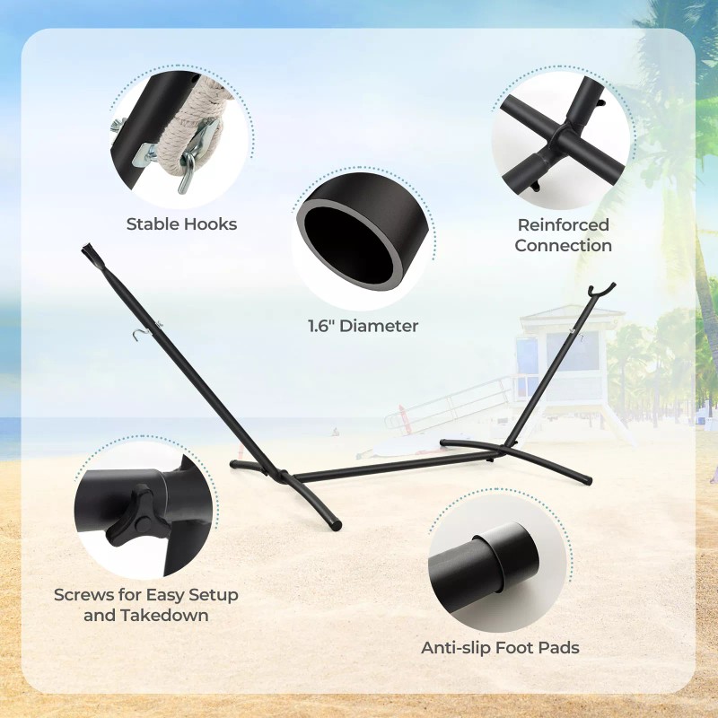 Adjustable Stand: Apart from bringing strong stability, this heavy-duty metal stand also comes with 6 holes spaced 4 inches at each end, which allows you to adjust the height, getting the most comfortable hammock height.||