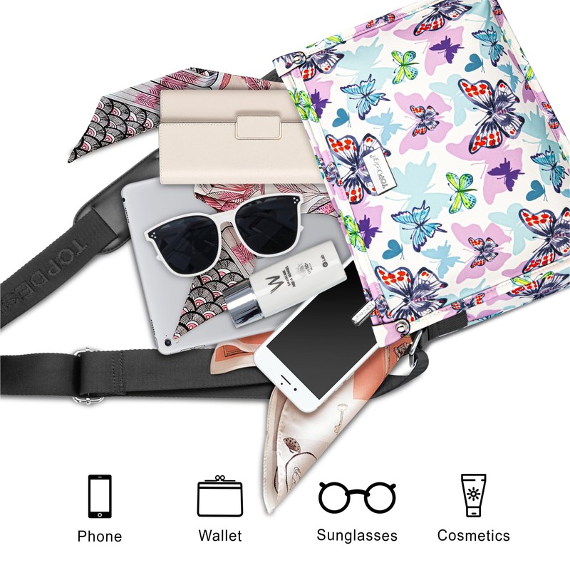 TOPDesign Lightweight Women Crossbody Bag, Shoulder Purse with Multiple Pockets, Triple Zip Handbag with Adjustable Shoulder Strap, Butterfly
