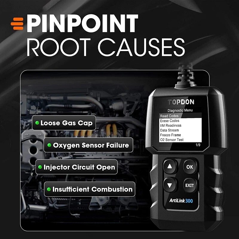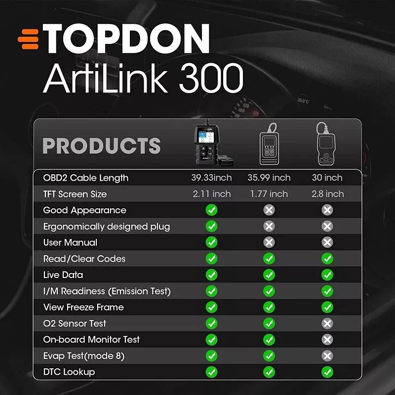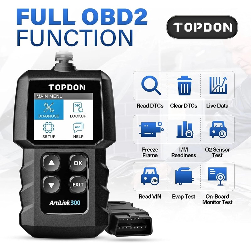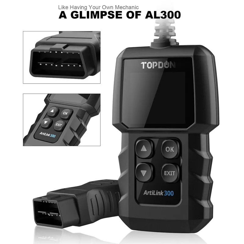 TOPDON ArtiLink300 is a quick, affordable OBD2 diagnostic tool for car .Code reader featuring all 10 modes of OBD2 Scanner test, DTC Lookup, plug-and-play function, and color display. This OBD2 scanner enables entry-level and DIY users to perform pre-inspections for smog tests, figure out the emission issues, and reset the Check Engine Light.
