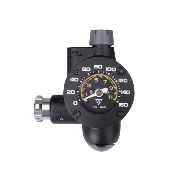 - Head compatible with Presta and American types; Engineering grade polymer; Includes dial gauge that measures up to 160 psi (cannot measure air pressure from English valve); Compatible with toppeak screws, 0.6 oz (16 g) / 0.9 oz (25 g) CO2 cartridges; Dust cap included; L2.0 x W2.0 x H1.3 inches (652 inches (452 g)