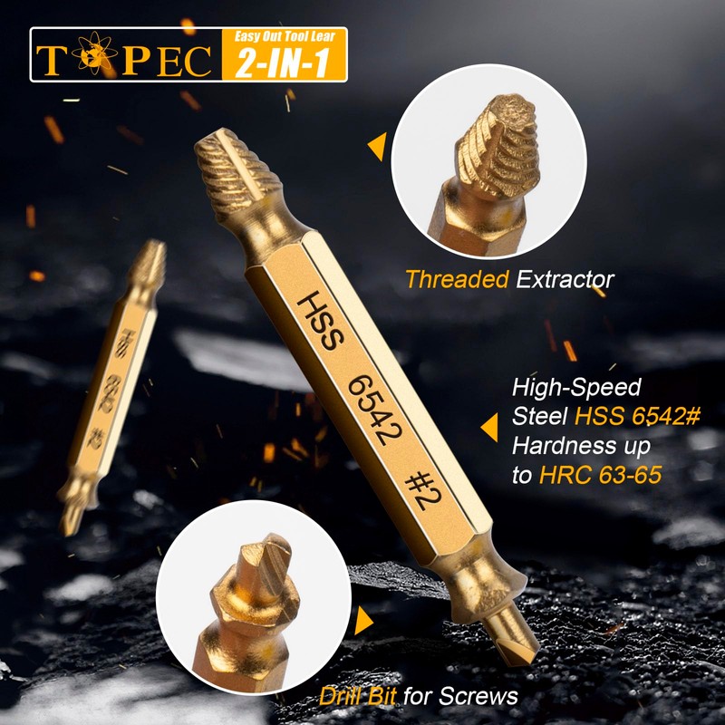 - Premium Materials: Enhanced with a titanium gold-plated surface treatment for anti-rust. The spiral screw extractors are made from CR-MO steel, the double-head damaged screw extractor set feature HSS 6542, 21% increase in hardness vs. #4341, ensuring durability and strength. These extractors resist corrosion and boast laser-etched markings for easy identification, meeting the demands of screw extractor bits and broken bolt extractor kits