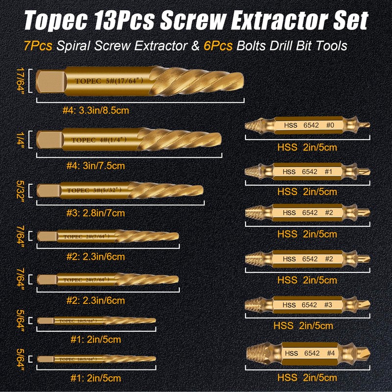 - Extensive Size Variety: This comprehensive 13PC Damaged Screw Extractor Set features 7 spiral screw extractors ranging from 1#5/64", 2#7/64", 3#5/32", 4#1/4", 5#17/64" (two 1# and 2#), along with 6 double-head extractors 0#, 1#, 2#(two #2), 3#, 4#. Perfect for any project requiring extraction tools like screw extractor sets, easy out bolt extractor kits, or stripped screw removers