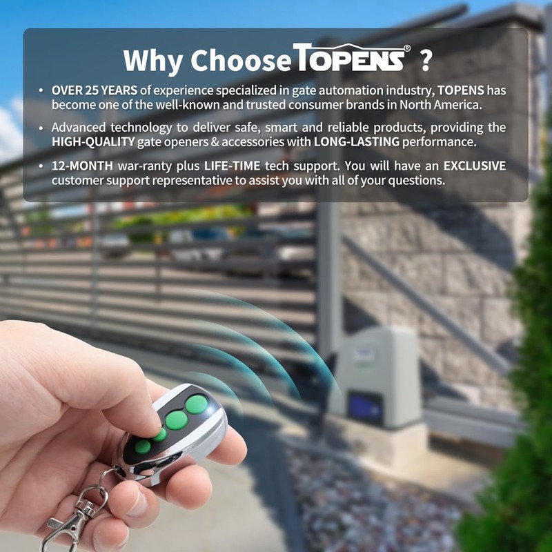 - 【Safe to Use】 TOPENS M12 remote control transmitter is a 4-button wireless controller and works with all the TOPENS gate openers. Simply press the button to enjoy instant access to your property. The advanced TOPENS security code technology keeps the gate opener system safe. Small & easy to take wherever you are. The remote transmitter is well built with a durable metal frame for long-lasting performance.