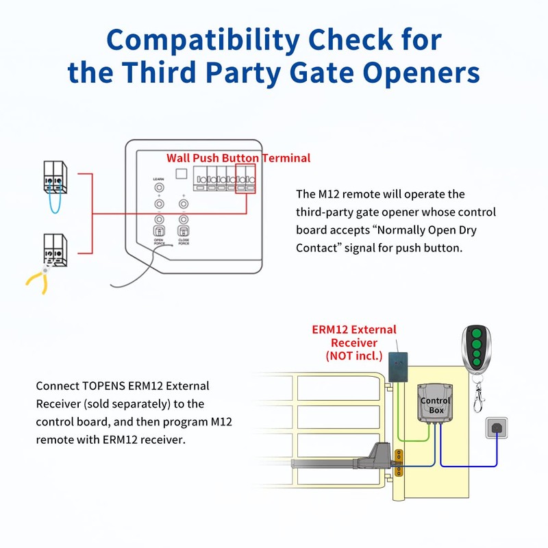 - 【Easy to Program】 All the TOPENS swing and sliding gate openers can be operated by the M12 remote. Fast pairing makes it simple to add the remote to your gate opener system using the programming button on the control board. The M12 remote will operate the third-party gate opener whose control board accepts “Normally Open Dry Contact” signal for push button, and connects with our ERM12 receiver (sold separately). The ERM12 can be powered by 9-24VDC from the control board or external power source.