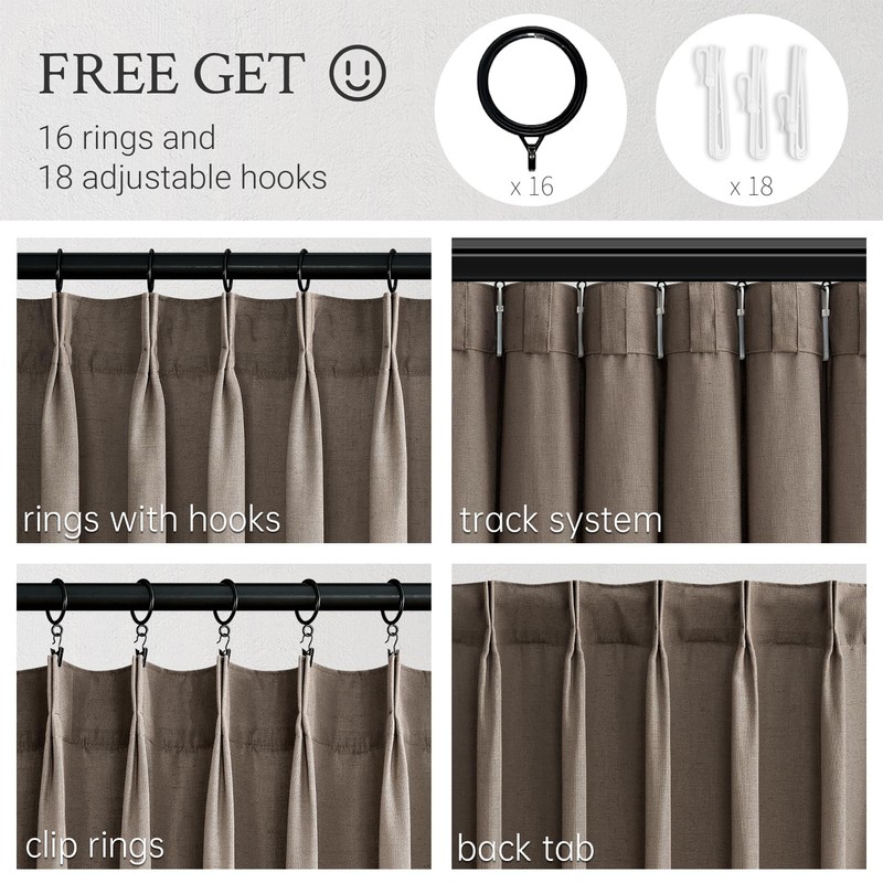 - Pinch Pleats Design:Each curtain panel with 7 pinch pleats generates modern and luxury feel.Linen curtains provide a natural,organic,and textured look that complements a variety of interior styles.By offering linen curtains in various colors,patterns,and lengths,we can cater to customers looking for a casual yet sophisticated window treatment.The simple yet stylish draperies add a touch of sophistication for modern living spaces.Hanging these pinch pleat curtains to elevate your windows and increase the aesthetic value to any spaces,bedroom,living room,nursery,office,etc