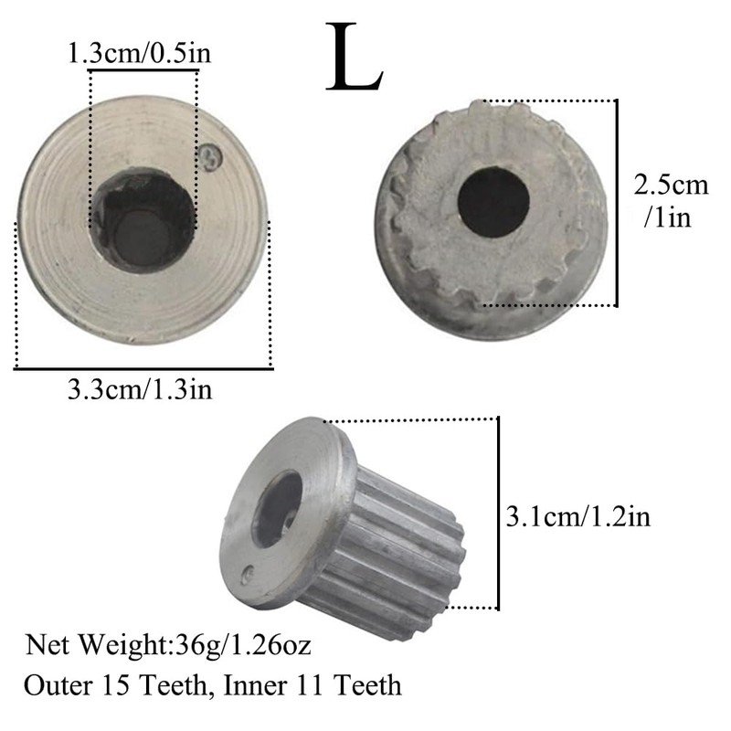 【Two sizes】We offer two sizes for you to choose from. The L size is 3.3*3.1cm/1.3*1.2in, with 15 outer teeth, suitable for washing machines with larger washing capacity; the S size is 2.8*2.7cm/1.1*1in, with 12 outer teeth, suitable for washing machines with smaller washing capacity. You can choose the appropriate washing machine impeller assembly core gear connector.
