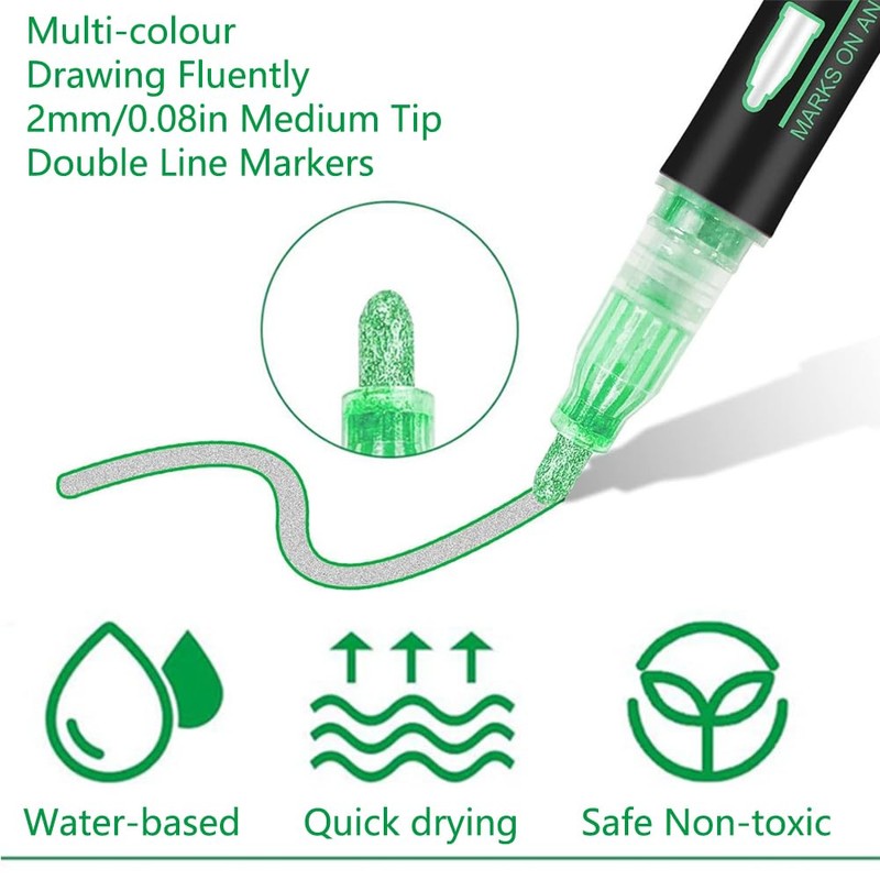 • 【Easy to Use】Double line glitter outline pen is easy to use and requires only a few steps: Firstly shake the marker well to mix the ink with the tip. Then remove the cap and press the nib gently against the surface a few times to start the ink flowing. Finally, for best results, recap the pen immediately after use and store it horizontally