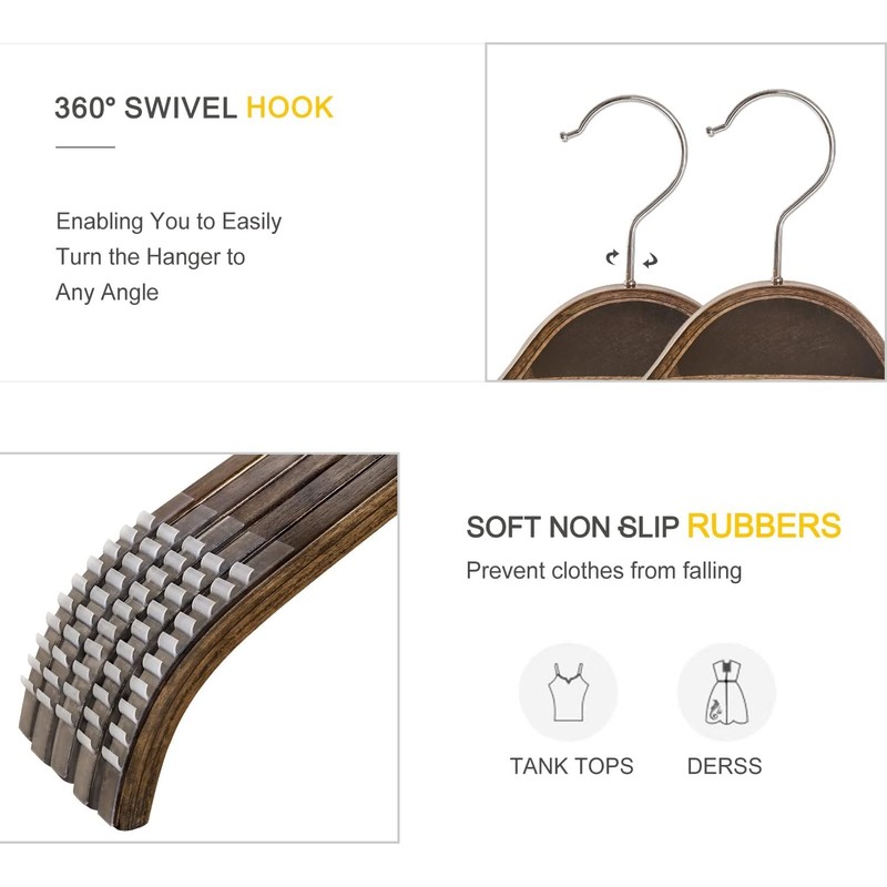 • Non-Slip Rubber Strips: Soft rubber tipped on the shoulders of the Hangers prevent clothes from falling, making the hanger suitable for strap dresses, camisoles or other wide necked clothing