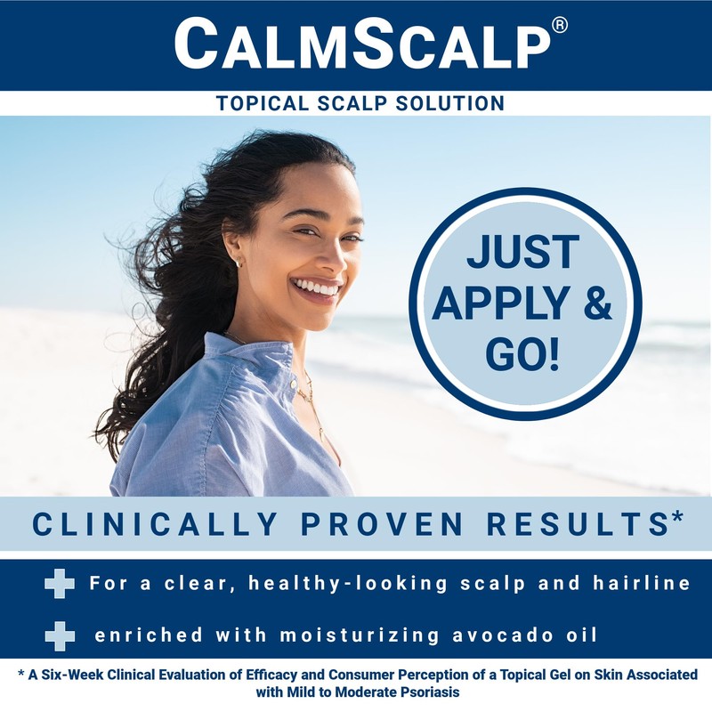 CalmScalp Topical Solution was formulated for the purpose of providing a safe, effective, drug-free solution for dry, flaking or red patches on the scalp and hairline. It is clinically proven to quickly calm irritated scalp and reduce unsightly red, scaly or flaking patches for a healthier-looking scalp and hairline. CalmScalp is also effective for improving the symptoms of mild to moderate psoriasis. Its unique ethanoic acid formulation is free of steroids, coal tar, parabens, preservatives, and sulfates. CalmScalp is easy to apply and gentle enough to use twice a day- simply apply and go! While non-greasy, non-staining, and fast-drying it is enriched with moisturizing avocado and penetrating grapeseed oil. The effectiveness of CalmScalp Topical Solution can be seen in actual before and after images from a clinical study. In the before images, scalp and hairline areas are red, scaly, dry, or rough, the common symptoms of irritated scalp or mild to moderate psoriasis. After using CalmScalp for either one, three or six weeks, the images show reduced redness, exfoliated scales, smooth and softer skin, and an improved appearance overall. Dermatologist tested and made in the USA, CalmScalp comes in a 4 oz. bottle and is money-back guaranteed.