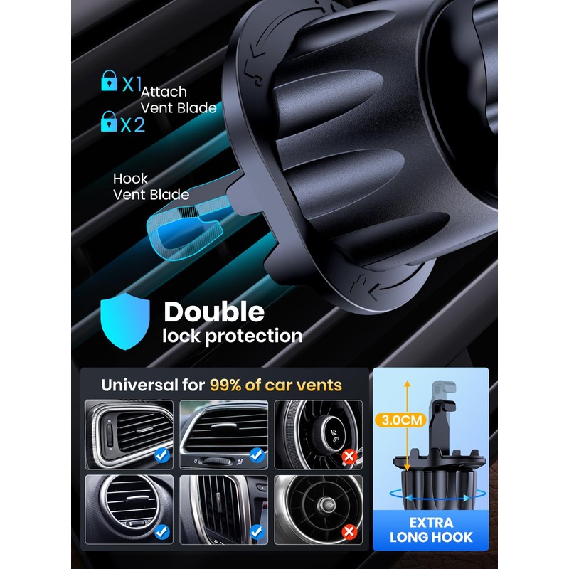 - 【Secure Hook Design】This car phone holder with the latest hook clip design, can be securely attached to the air vents. The hook length can be adjusted by rotating the gear on the base to match different vents depths. Note: Not suitable for circular air vents.Incompatible with Magsafe function.