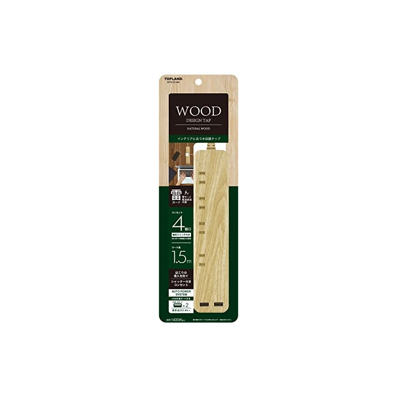 TOPLAND MTS15-NW Power Strip Lightning Guard with Individual Switch (4 Outlets / 2 USB Ports), Outlet with Shutters, Cord Length 3.9 ft (1.5 m), Auto Power System, Natural Wood