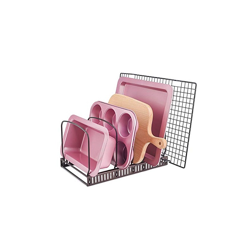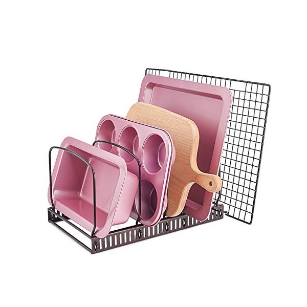 Toplife 10+ Bakeware Organizer Rack for Kitchen Bakeware, Cookware, Dinnerware, Cutting Boards, Plates, Pot and Pan Lids (Brown)