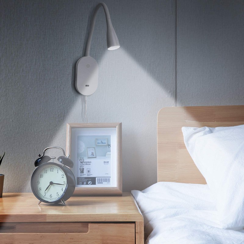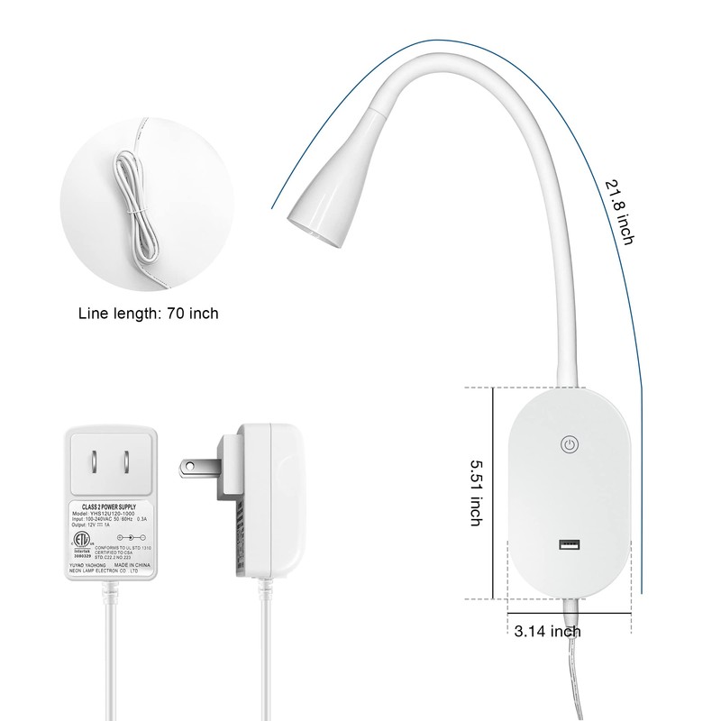 TOPMB Wall Mount Reading Light, Focused Book Light for Reading in Bed, 5 Dimming, USB Output, 4 Hours Auto Off, Touch Control, Flexible Gooseneck Headboard Reading Lamp, Easy to Install White